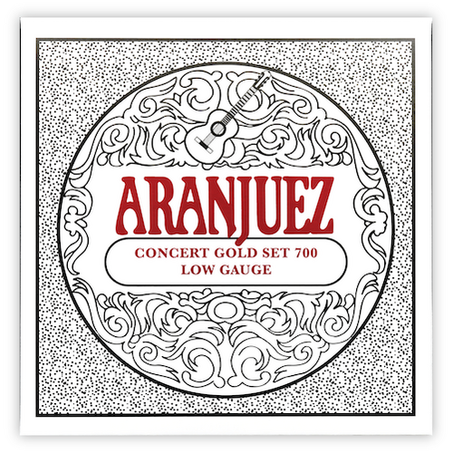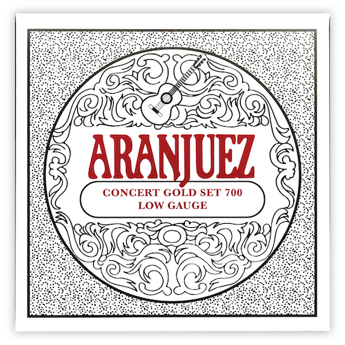 Aranjuez Concert Gold 700 Low Tension Classical Guitar Strings are a full set of classical strings that have brilliant tone, fast response and optimal projection. Calibrada trebles (clear nylon with a slight lavender hue) paired with bronze alloy basses provide a full and brilliant tone with fast response.