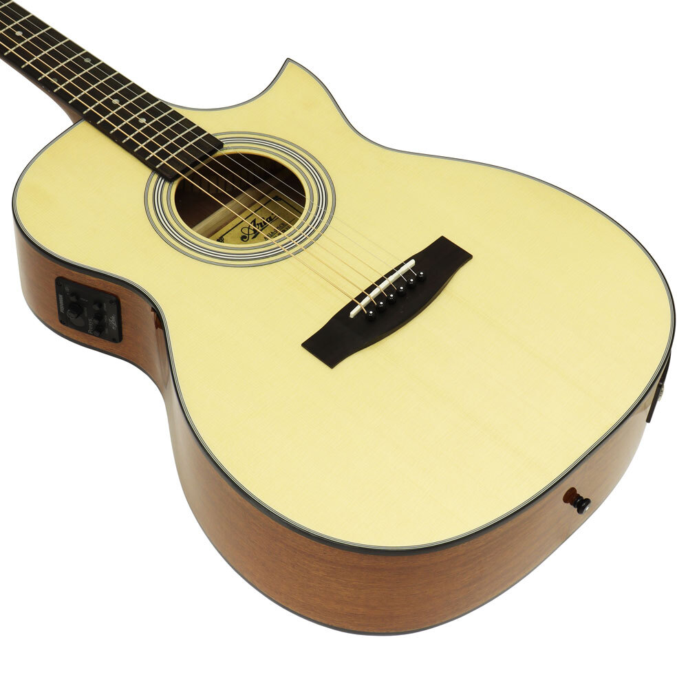 ARIA-201 offers perfect versatility for a wide range of player's needs with a Solid Spruce top, Mahogany back and sides, Mahogany neck with a Pau Ferro fingerboard and a superb looking venetian cutaway. All this and a beautiful Natural Gloss finish.