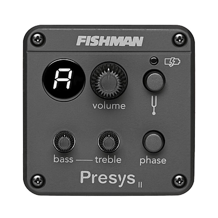 The onboard electronics are handled by the Fishman Presys II Preamp System which is dedicated to providing maximum sound quality in a small footprint. This preamp system features Volume, Tone shaping and Phase controls. A Fishman Sonicore pickup and low profile control knobs. Also included are a low battery indicator and a separate battery box.