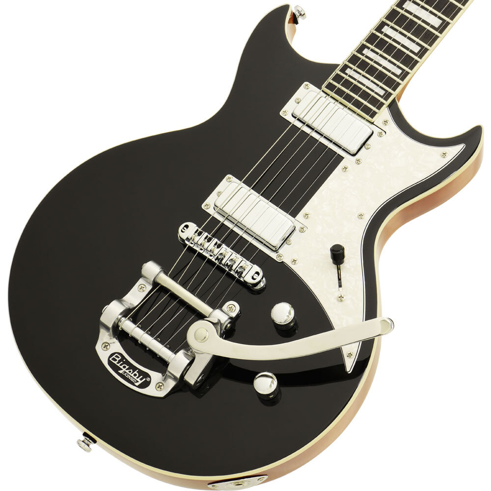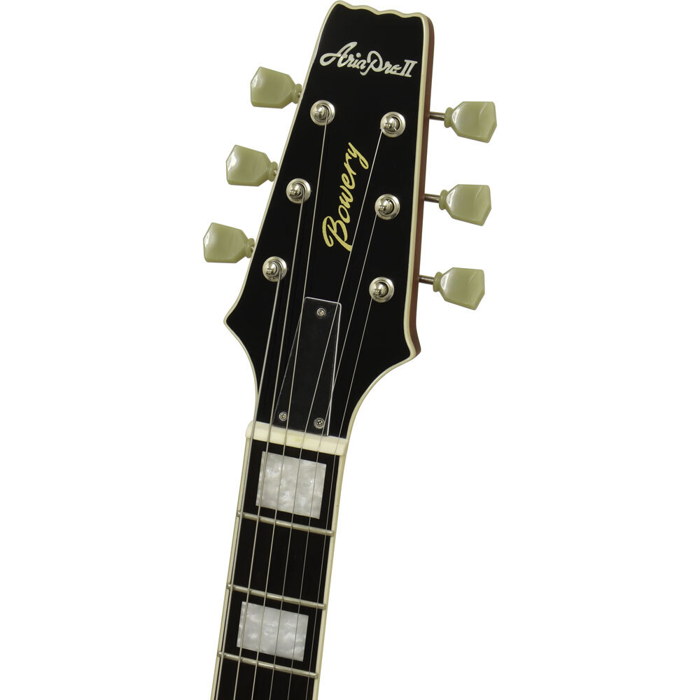 The Aria Pro II 212-MK2 "Bowery" is a chambered body electric guitar. The double cut design and chambered body construction combine to create a perfectly balanced and lightweight guitar. A pair of mini-humbuckers were employed to drive its airy pure semi-hollow resonance with rich mid-range harmonics. The Bigsby tailpiece is another premium feature that gives an airy mellow vibrato and an undeniable classy vibe.