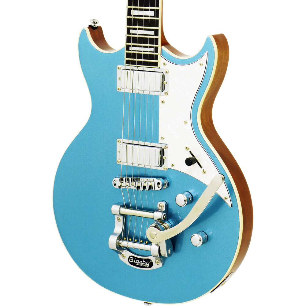 The Aria Pro II 212-MK2 "Bowery" is a chambered body electric guitar. The double cut design and chambered body construction combine to create a perfectly balanced and lightweight guitar. A pair of mini-humbuckers were employed to drive its airy pure semi-hollow resonance with rich mid-range harmonics. The Bigsby tailpiece is another premium feature that gives an airy mellow vibrato and an undeniable classy vibe.