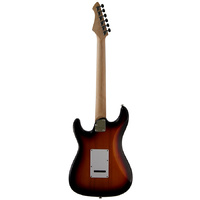 With true Aria design, the 714-STD Electric Guitar features a slashing cut look with the 3-Tone Sunburst finish and white pearloid pickguard, a 25.5" scale maple neck, 22-fret fingerboard with dot inlays and Vintage style tremolo.
