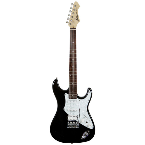With true Aria design, the 714-STD Electric Guitar features a slashing cut look with the Black finish and white pearloid pickguard, a 25.5" scale maple neck, 22-fret fingerboard with dot inlays and Vintage style tremolo.