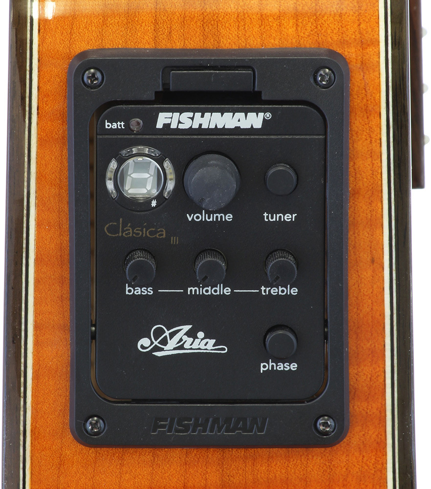 The Aria A-48CE is a thin body cutaway classical guitar with a Solid Spruce top and Flamed Maple back and sides. The 14th fret neck joint and 45mm nut width make a playability effortless at higher fret positions. Perfect versatility for any type of players even for non classical guitar players. Equipped with Fishman Classica III preamp system with built-in tuner.