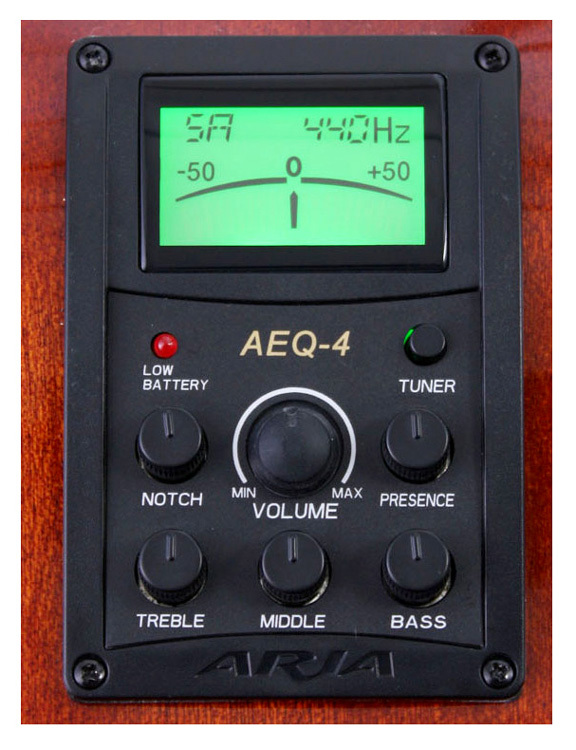 The body built with a Spruce top and Sapelli back and sides generates clear projection and genuine acoustic sound. Aria original preamp AEQ-4 enables you to create various tone controls as well as offering the advantage of an on-board tuner.