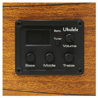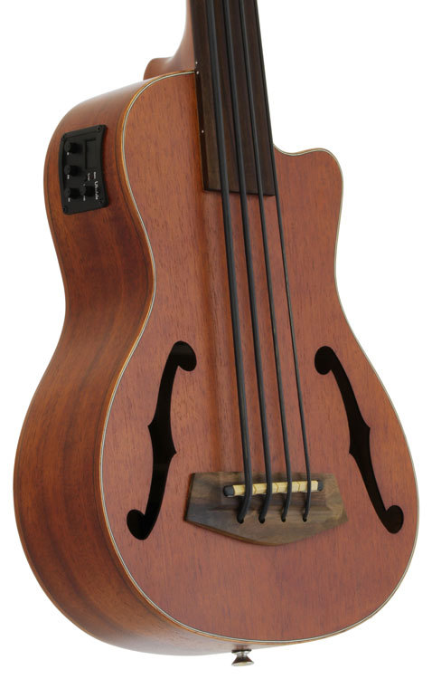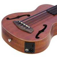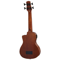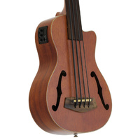 The Aria AUBCEFL is a Fretless Ukulele Bass. It can be played in a standard bass tuning (G-D-A-E), and is strung with Aquila "Thunder Black" strings. The on-board pre-amp enables you to make a wide range of tone control.
