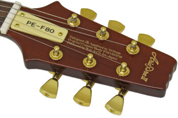 The Aria Pro II PE-F80 is a budget friendly version of "PE-R80" which was originally launched in 1980. The PE-F80 inherits the genuine elegance of what "PE-R80" offers such as strong curved body top with recessed control knobs and switch, cloud shaped fingerboard inlays, heel-less cutaway neck joint while contoured flat body back is reducing the entire body weight.