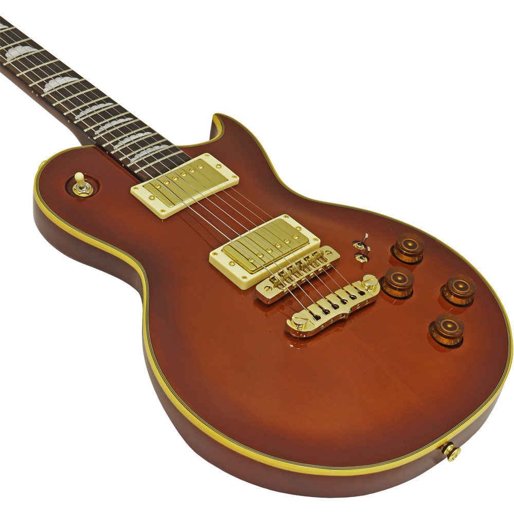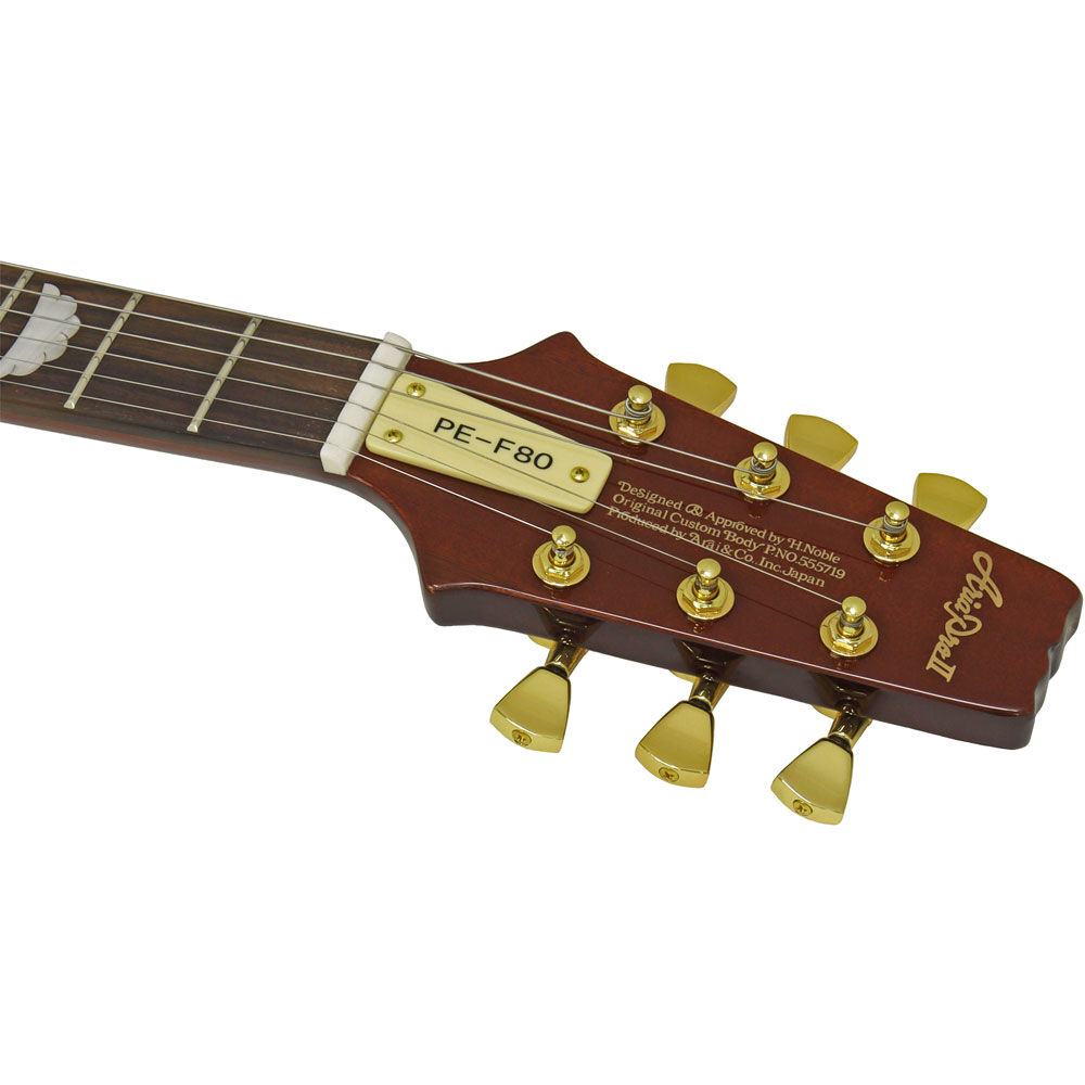 The Aria Pro II PE-F80 is a budget friendly version of "PE-R80" which was originally launched in 1980. The PE-F80 inherits the genuine elegance of what "PE-R80" offers such as strong curved body top with recessed control knobs and switch, cloud shaped fingerboard inlays, heel-less cutaway neck joint while contoured flat body back is reducing the entire body weight.