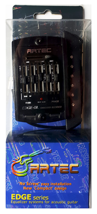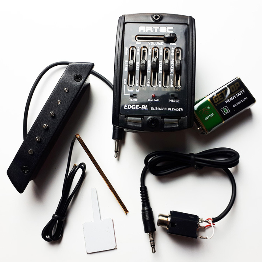 The EDGE-BL has a Blender EQ and basic controls of Bass, Middle, Treble and Presence. Through the AUX-INPUT jack at the bottom a Condenser Microphone or Soundhole Pickup can be connected. This pack contains both an undersaddle piezo pickup and a magnetic soundhole pickup.