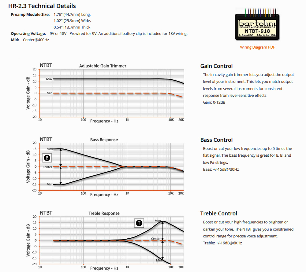 The NTBT is a 2-band tone control preamp with fully independent Bass and Treble controls. The voice is clear, transparent, and strong with wide boost and cut range for aggressive control. The NTBT features an adjustable gain which allows you to boost the input signal up to 12dB while maintaining flat frequency response. A professionally pre-wired and fully pre-tested harness saves the time and aggravation of wiring your preamp and pots into your instrument.