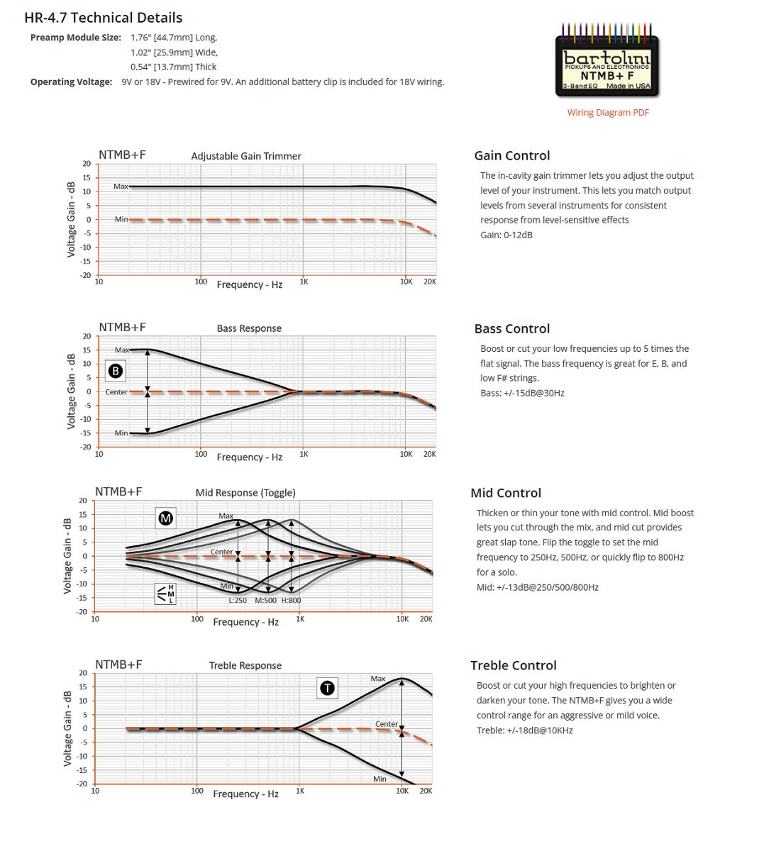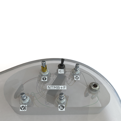 Wired with our NTMB+F pro-level pre-amp and premium audio-quality pots and switches, you''ll have smooth control and be ready for years of rugged use. We include battery clips and an output jack for quick installation. This configuration has a 3-Band EQ, 4 Pots and 1-Toggle: (Volume with Pull-Bypass Switch) (Blend) (Mid) [250,500,800Hz Mid Toggle] (Treble/Bass Stack)- Active/Passive.