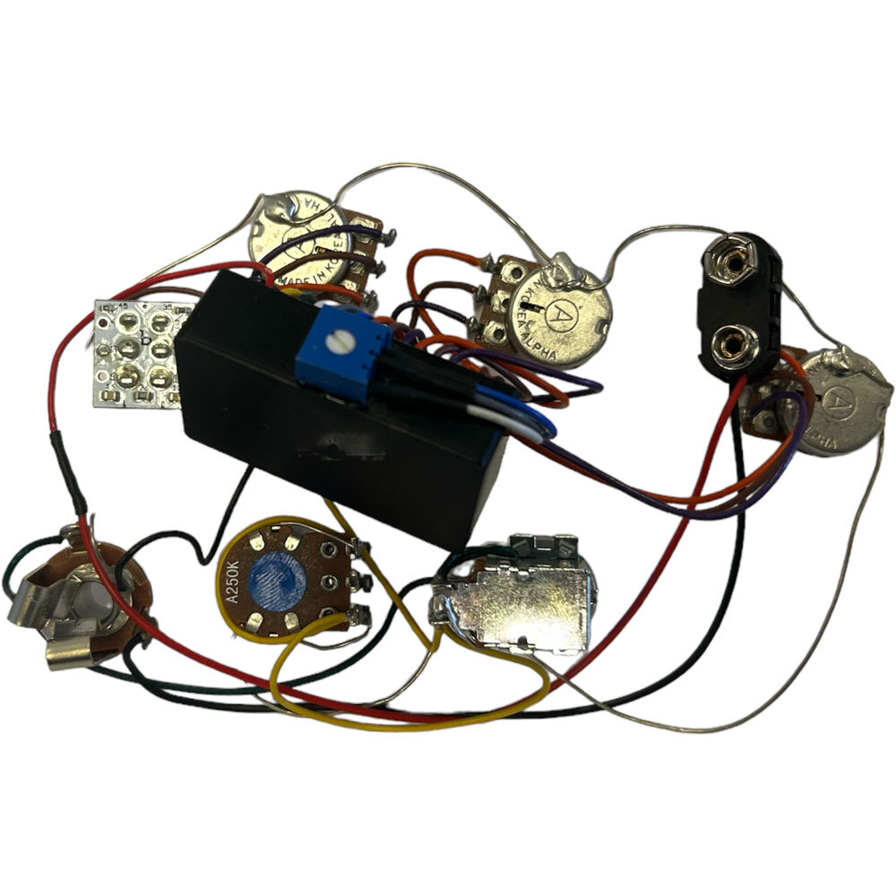 A professionally pre-wired and fully pre-tested harness saves the time and aggravation of wiring your preamp and pots into your instrument. Wired with our pro-level preamp and premium audio-quality pots and switches, you'll have smooth control and be ready for years of rugged use. We include battery clips and an output jack for quick installation. All the pots are grounded with a wire that can be connected to the cavity shield or simply cut away if not needed in your installation.
