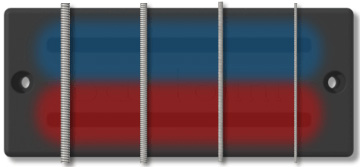 Your voice is a combination of your pickups, strings, instrument materials and construction, and playing technique. The voice of your pickups is determined by the sensing structures - the magnetic field projected onto the strings and the interaction of the magnetic field with the coils. We offer several carefully designed pickups series with different sensing structures so you can develop your voice. Check out the sensing structures below - Blue represents a South magnetic field, and Red represents a North magnetic field. Opposite polarity fields is used for hum-cancelling.