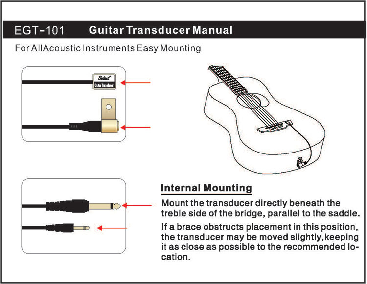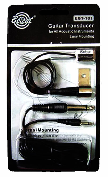 The Belcat EGT-101 is an easy to mount single piezo transducer that opens a whole new world of effects and amplification to acoustic instruments such as acoustic guitars, ukuleles, violins etc. This product can be used on steel or nylon string instruments.