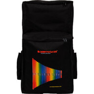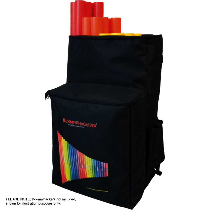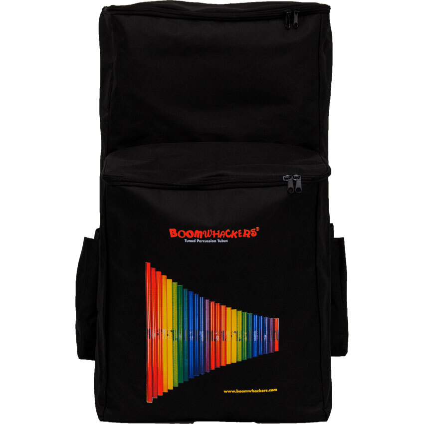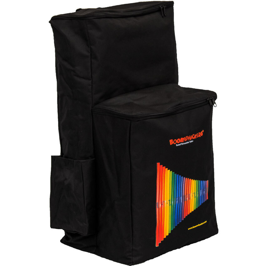 This bag is made of heavy nylon with reinforced handles and seams and features two large zippered compartments. The taller compartment will hold tubes as long as the 24" C tube and the shorter compartment will hold tubes as long as the 16" G tube and still allow the zippers to close. It's perfect for on the go Boomwhacker activities and for storing them when done!