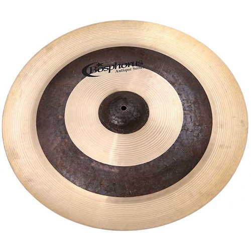 The Bosphorus Antique Series China, a clean, crisp cymbal. The top side features an un-lathed bell and an additional un-lathed strip between the bell and the edge. The bottom side of the cymbal is completely lathed in the traditional manner.