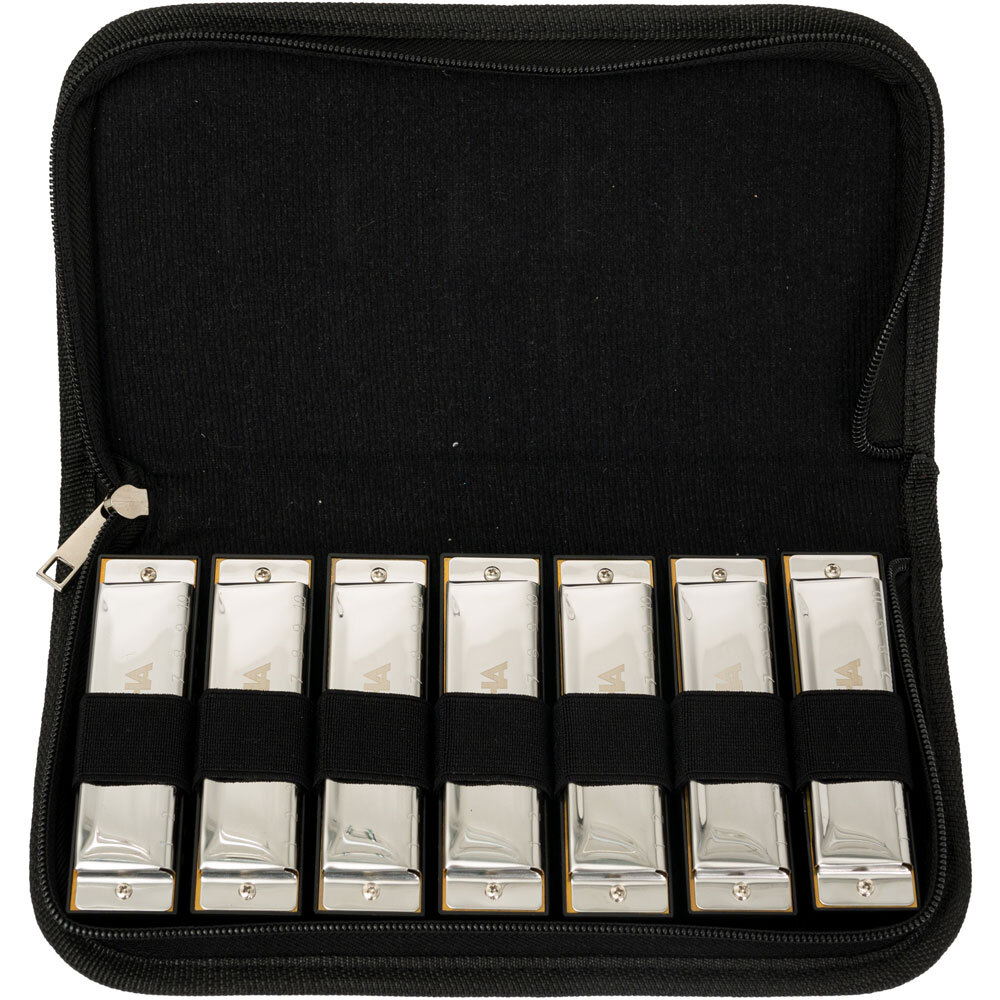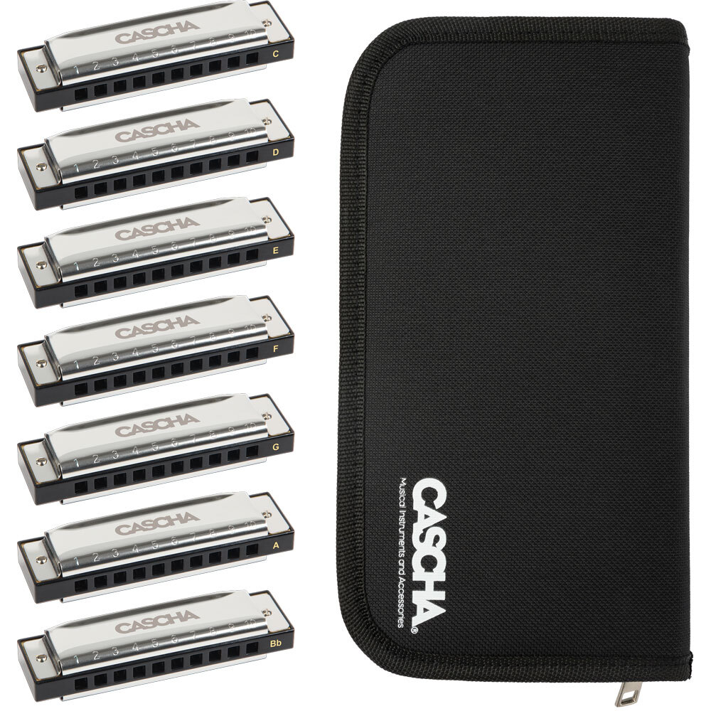 This set contains the Cascha Blues harmonica in 7 keys (C - D - E - F - G - A - Bb) packed in a practical bag for storage and safe transport of the harmonica.