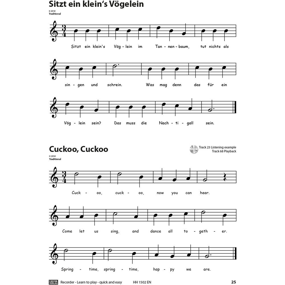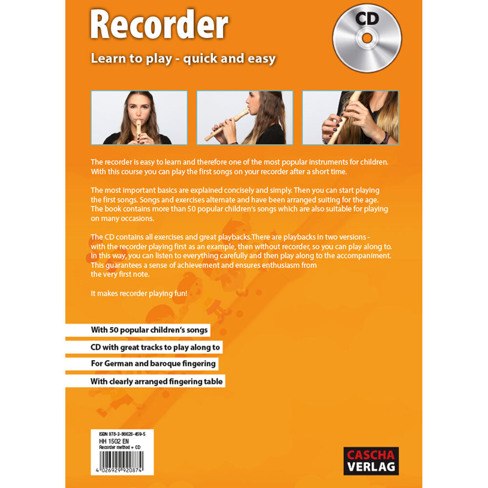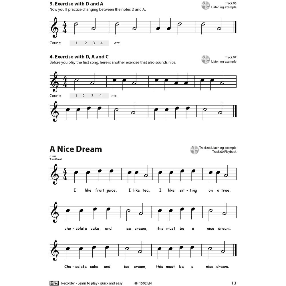 The CD contains all exercises and great playbacks.There are playbacks in two versions, with the recorder playing first as an example, then without recorder, so you can play along to. In this way, you can listen to everything carefully and then play along to the accompaniment. This guarantees a sense of achievement and ensures enthusiasm from the very first note. It makes recorder playing fun!