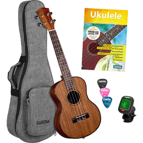 Just unpack and have fun. This bundle includes everything you need for playing the ukulele. The Cascha Premium Tenor Ukulele impresses with its high quality and the excellent sound properties of the used wood types.