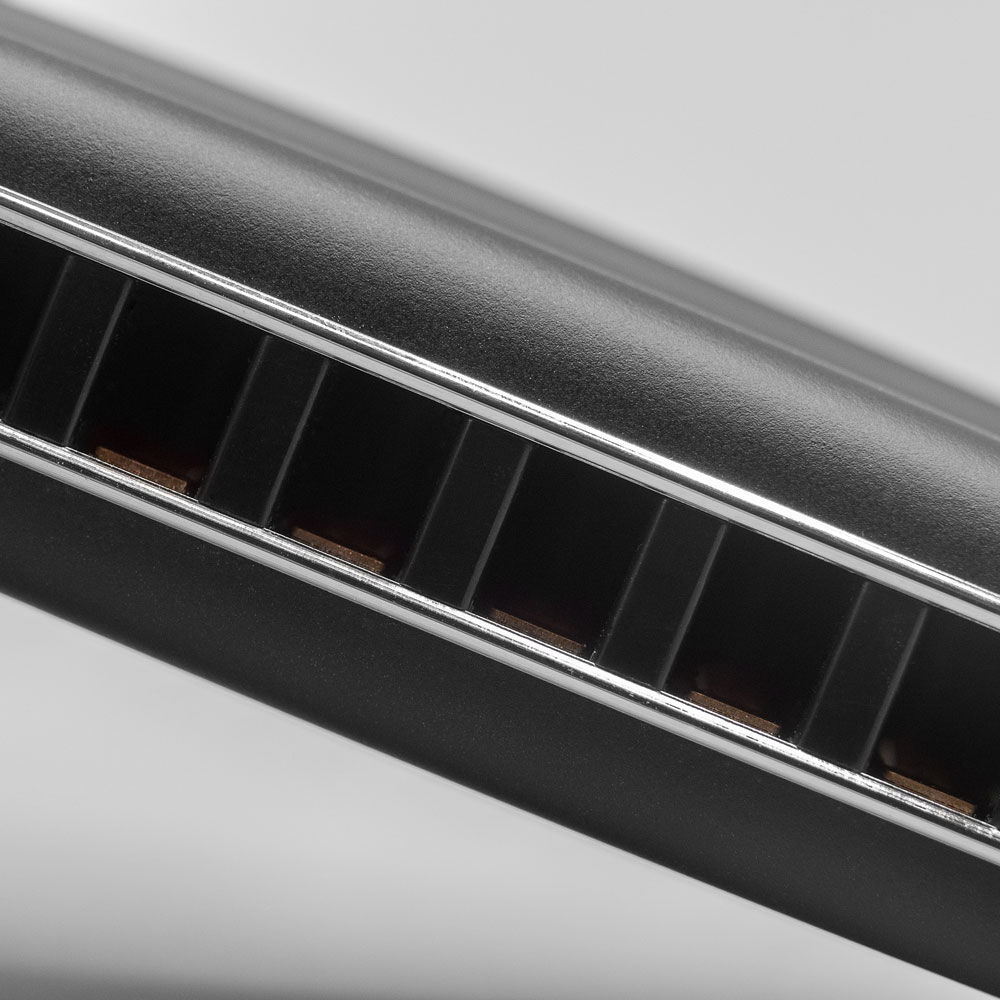 The special phosphor bronze reedplates are more sensitive than comparable copper reeds. They respond more easily and thus allow a more detailed playing. Every nuance of the sound is brought to bear. The Blues harmonica is tuned in C major, this is the most popular version of the harmonica.