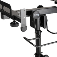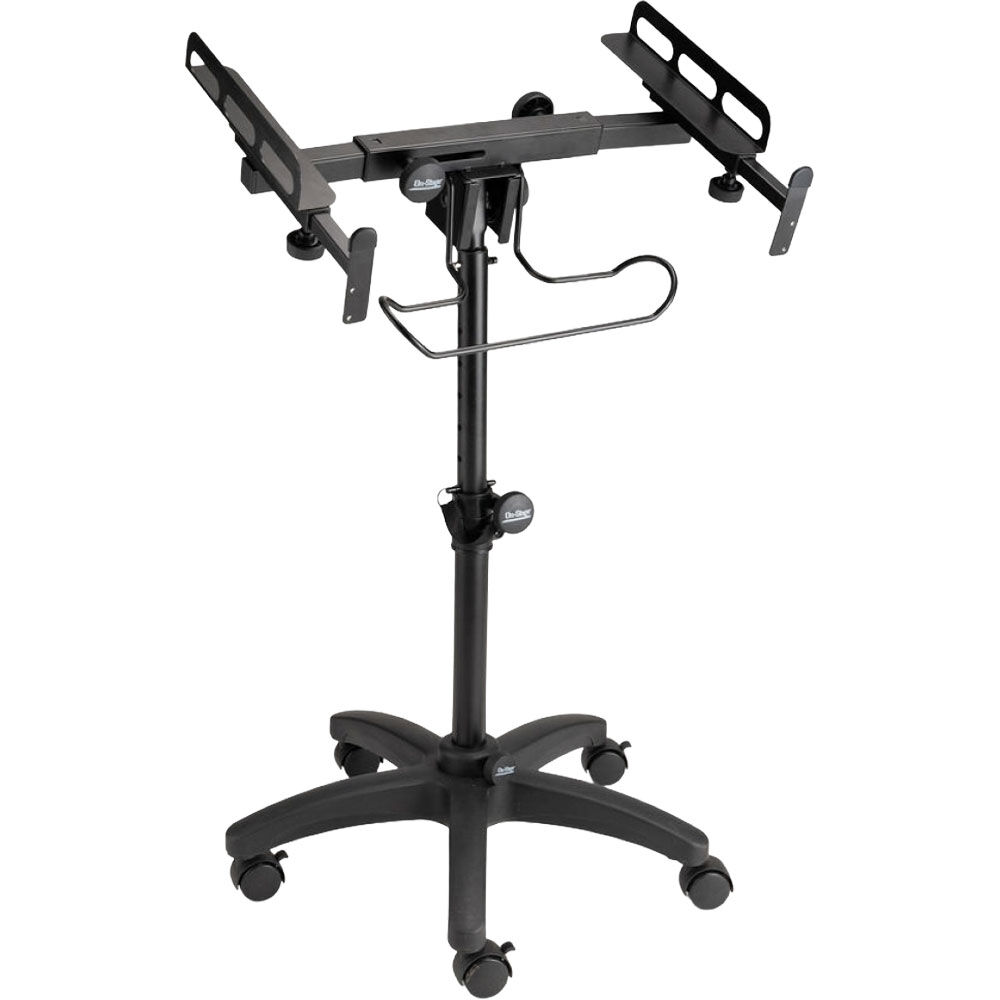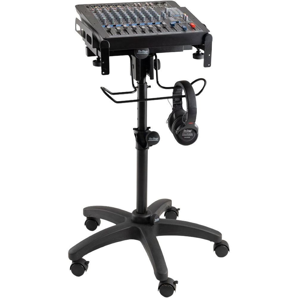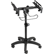Adjustable height and tilt angle enable positioning of the device for comfortable operation. Heavy-duty construction and five base legs deliver balance and stability to reliably support gear. For ease of movement and precise placement, the base rolls on casters that can lock for stationary use. Features a headphone hanging rack for storage of headphones or cables. To simply storage and transportation, the stand disassembles into three pieces.