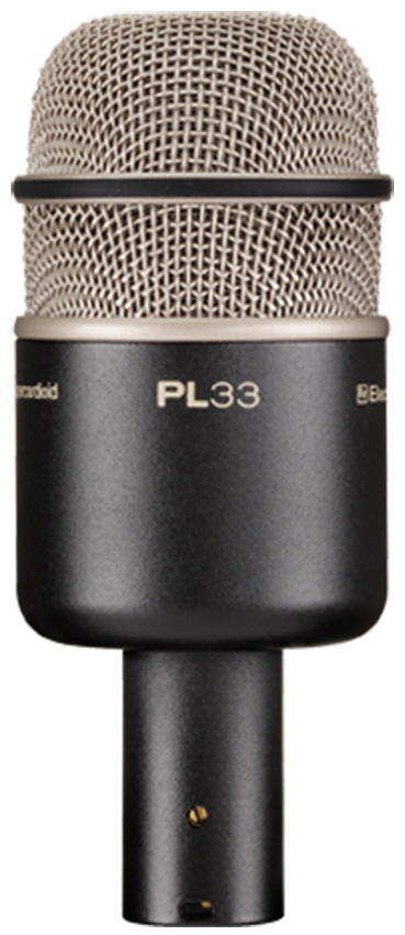 With its tight low end, kick drum-modified mid-range and high frequency response, the PL33 delivers all of the percussive impact detail professional drummers and sound system engineers require. The PL33's tight supercardioid polar pattern is designed to minimize off-axis information entering the capsule, and allows for a very isolated instrument sound and higher gain before feedback. Although designed to be a kick drum microphone, the PL33 also functions quite well as a low tom and bass guitar speaker cabinet microphone.