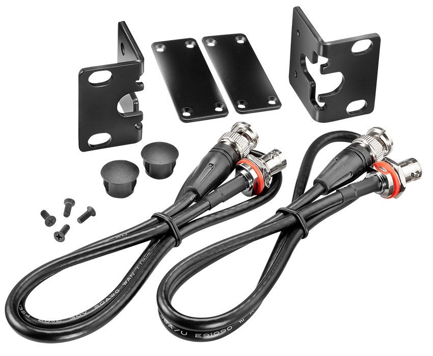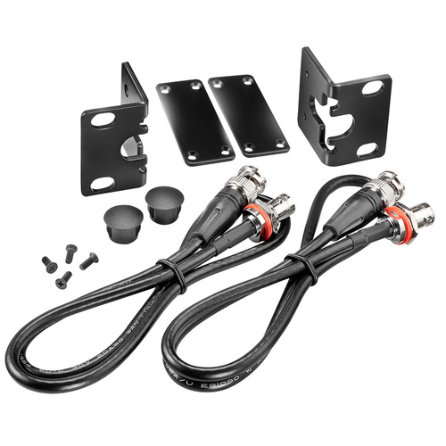 The bridging plates firmly couple two receivers together ensuring the receivers are held securely in a rack. The rack ears easily mount to the receiver's threaded mounting holes using the provided screws. The threaded front flange mount ends of the antenna cables mount into the rack ears and securely mount either the stock receiver 1/2 wave antennas, or coax extension cables for remote antenna applications.