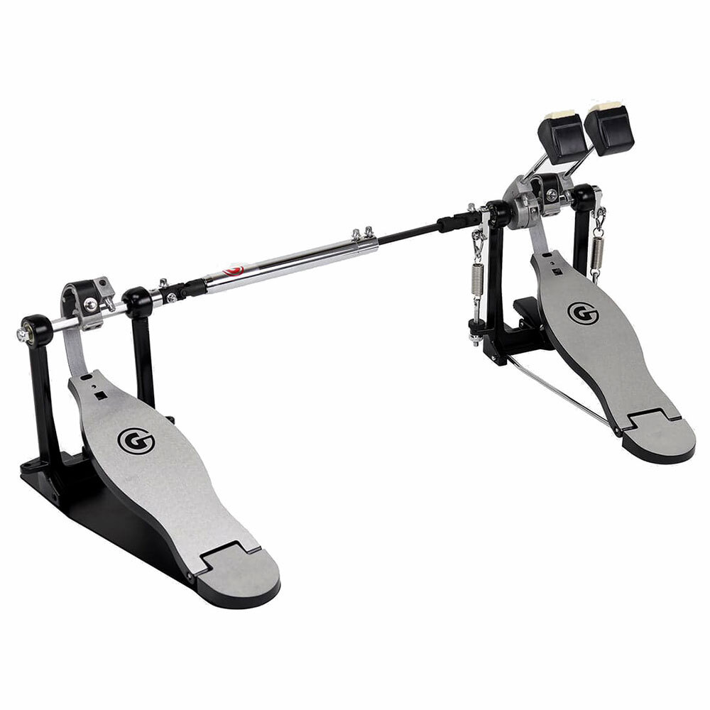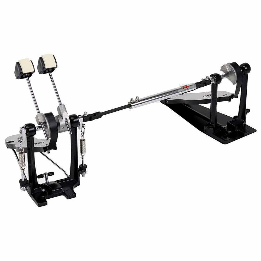 This lightweight strap drive double pedal offers a swift feel. Its smooth G-Styled footboards and heel plates offer a sleek look and are great for players who like to slide their feet on the footboard. Its sturdy all-cast metal frame offers stability and solid mounting to the bass drum hoop. The adjustable connector drive, easy-to-access tension adjustment, and two dual-surface bass drum beaters make this pedal a contender for all players.
