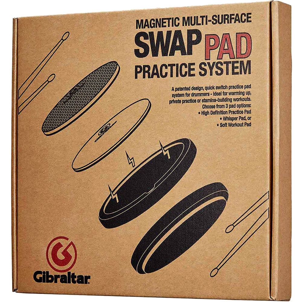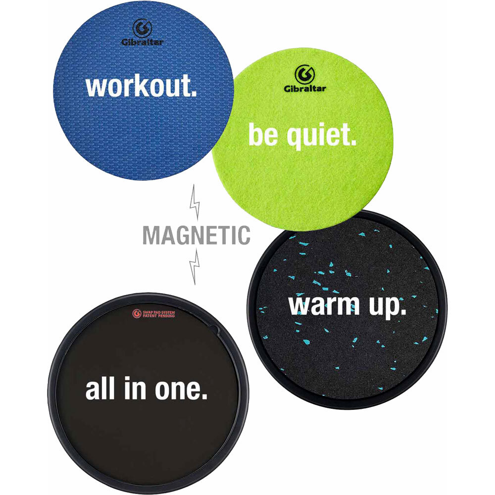 The 9" Swap Pad Drum Practice System is a unique 3-in-1 practice pad featuring swappable playing surfaces that connect magnetically to the same base.