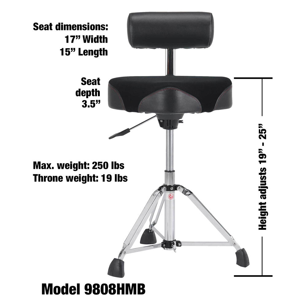 The 9808HMB 16" Hydraulic Saddle Drum Throne features a Cordura seat that offers an enhanced layer of comfort for musicians. The drum throne comes complete with a fully adjustable backrest and easy one-touch height adjustment.