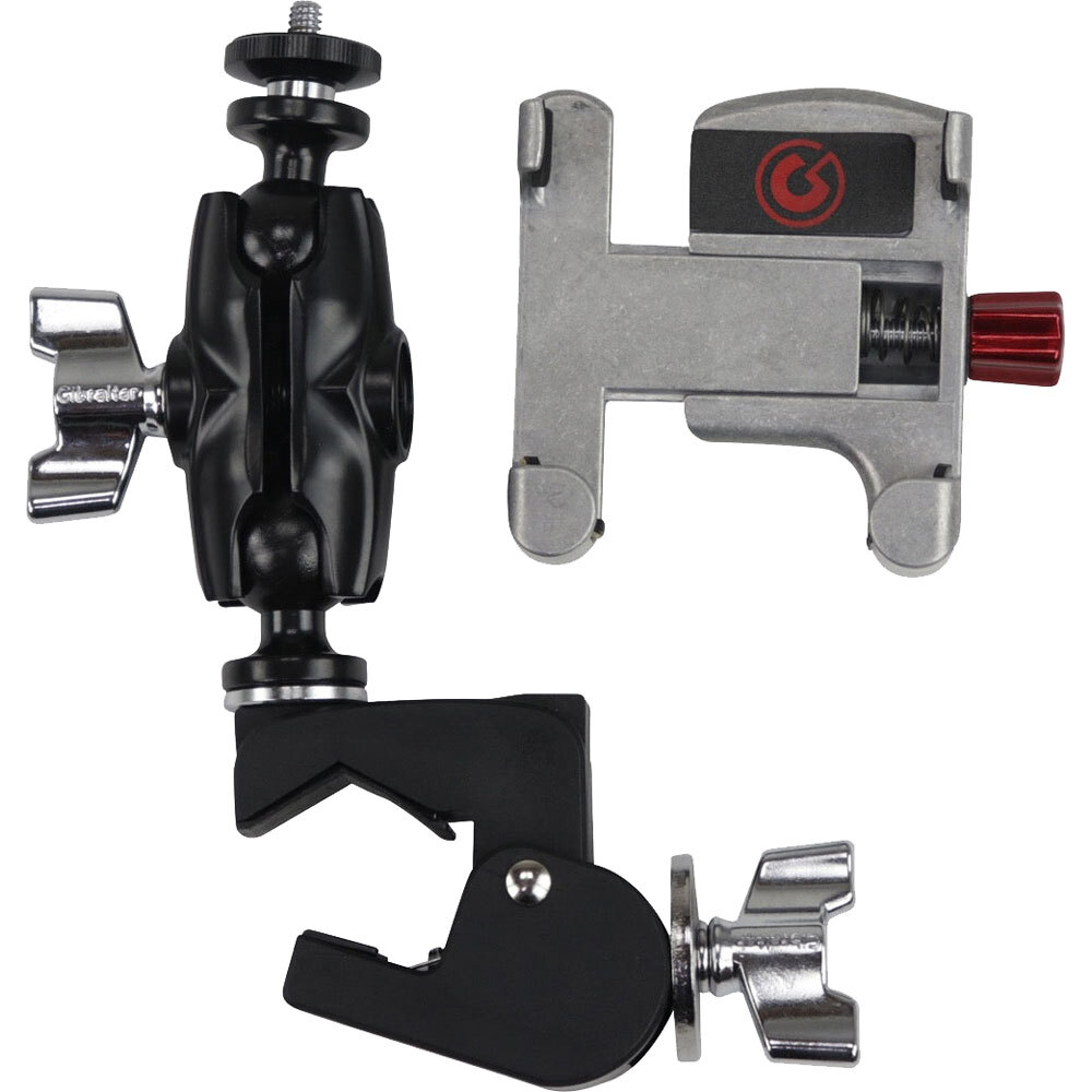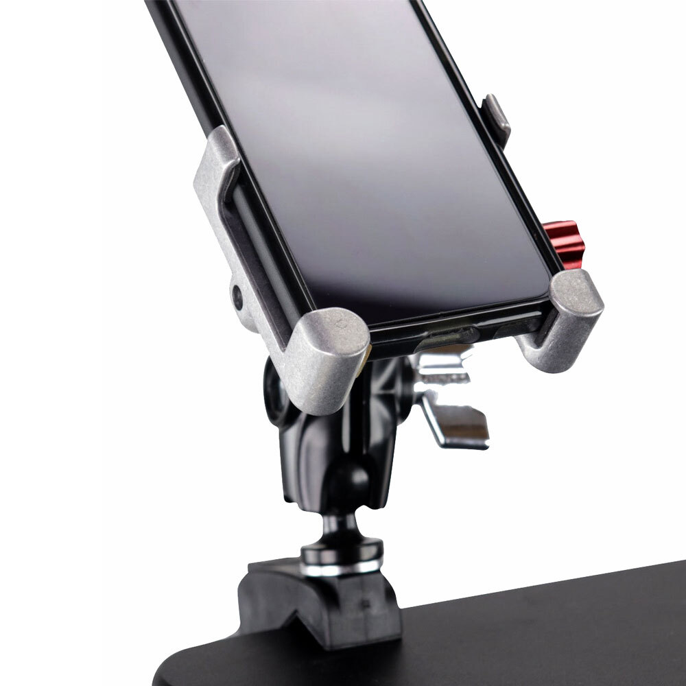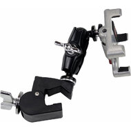 The Dual Adjust Metal Smartphone holder offers unlimited angle adjustment in landscape or portrait mode, with a heavy-duty C Clamp that mounts to tables, cymbal stands, or microphone stands. Connect your phone to a stand anywhere on your kit with unlimited angle possibilities.
