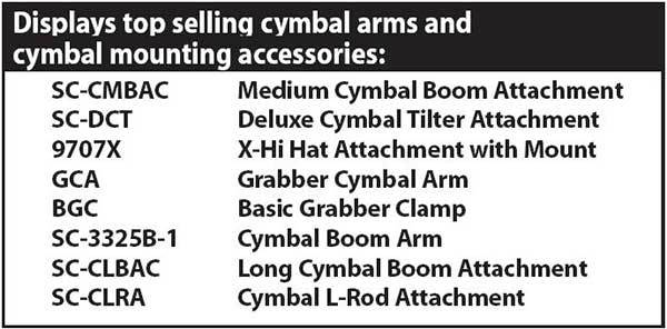 Everytime a cymbal is sold in your store, these high-impact displays provide an instant reminder that an additional cymbal arm or stand is a valuable addition to their purchase.
