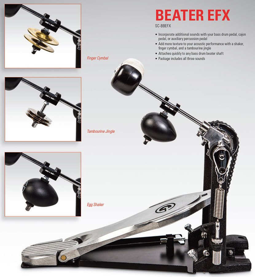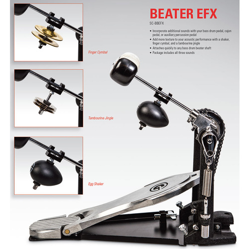 Incorporate additional sounds with your drum set, cajon pedal, or auxiliary percussion pedal. Add more texture to your acoustic performance with a shaker, finger cymbal, and a tambourine jingle. Attaches quickly to the bass drum beater shaft.