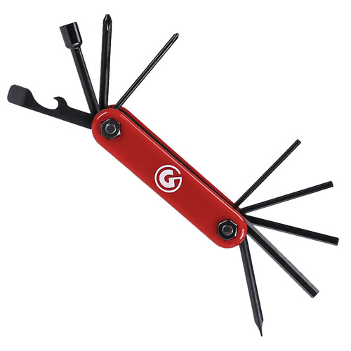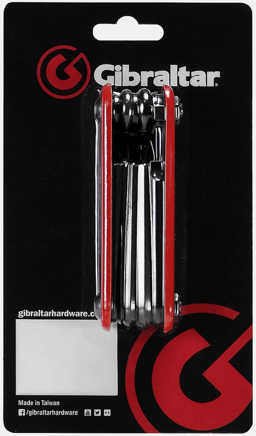 The pocket multi tool, is an all-in-one package that fits the most common tools a drummer needs into a fold up assembly. Tools included are: (2) different size Phillips screw drivers, (2) different size flat head screw drivers, (1) drum key, (1) bottle opener, (4) Allen keys; 2mm, 3mm, 4mm, 5mm.