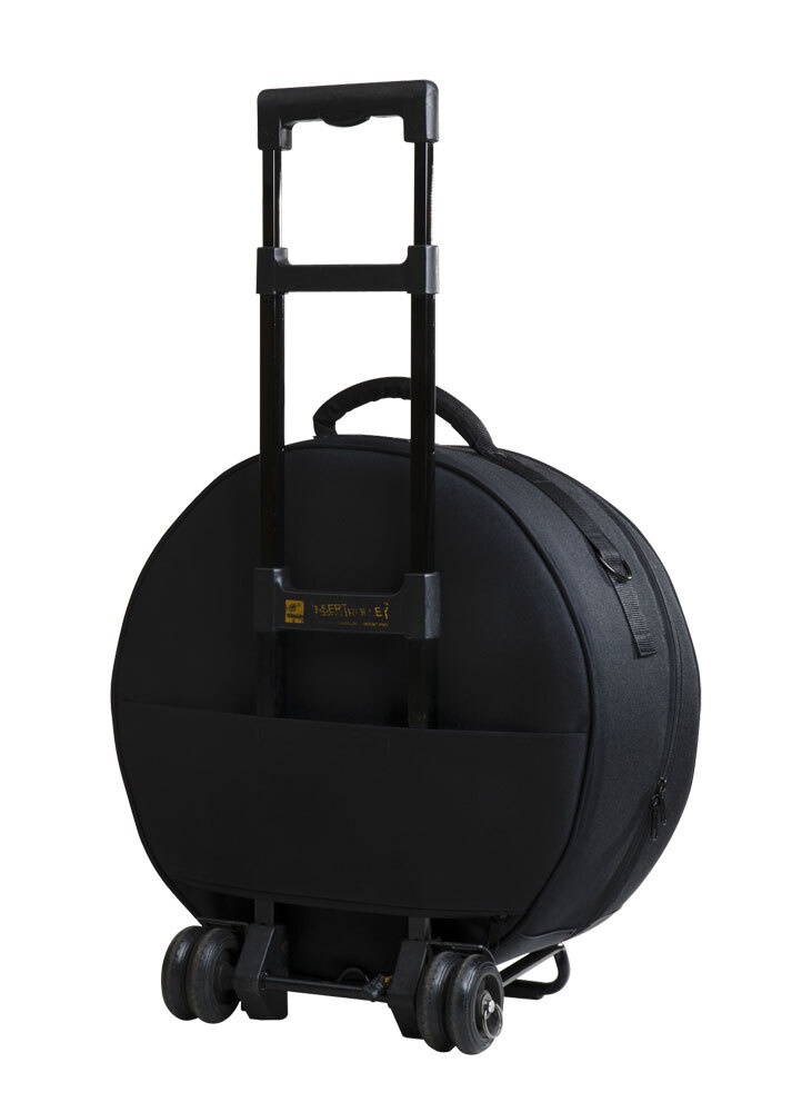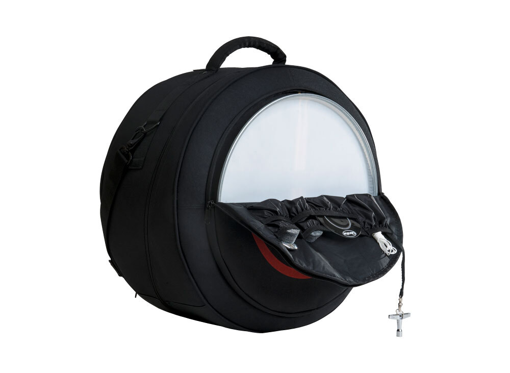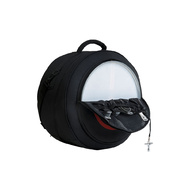 A plush interior is lined with 1.4" thick foam for increased support. The front exterior of the bag has an accessory pocket that can be used to carry a back up drum head, pair of sticks, and smaller parts and accessories. It is also equipped with a name tag holder and two wheeler mounting strap for traveling.