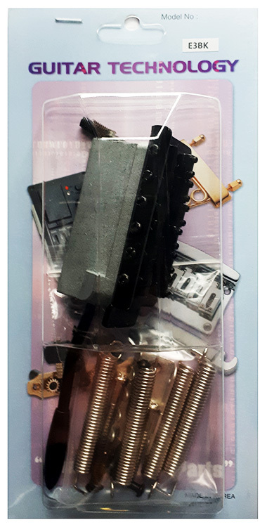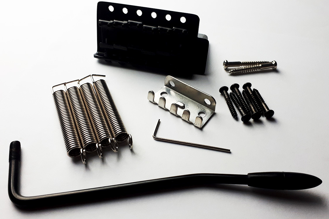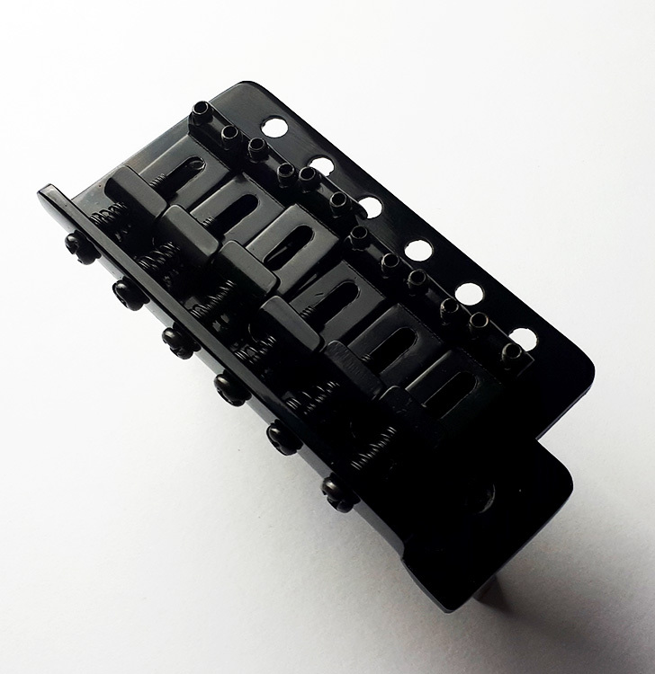 A traditional 6-screw mounted tremolo bridge in Black Finish with vintage style stamped steel saddles and steel block.
