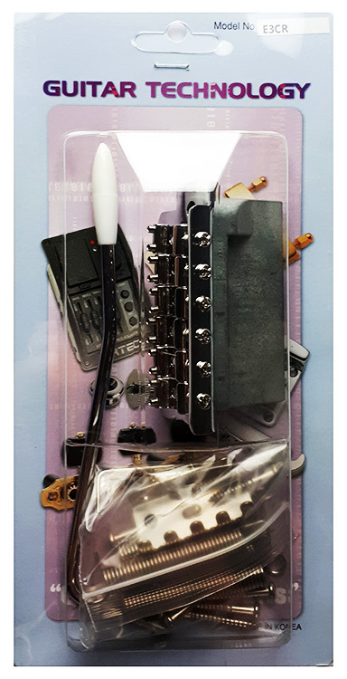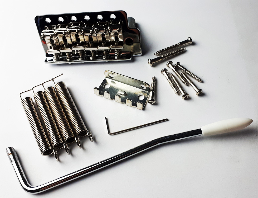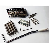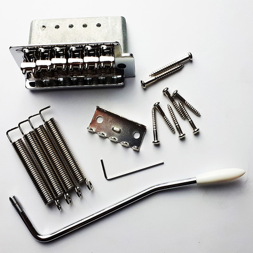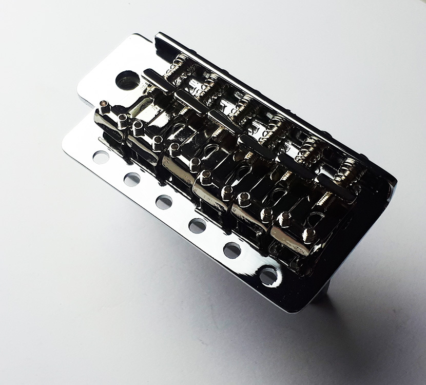A traditional 6-screw mounted tremolo bridge in Chrome Finish with vintage style stamped steel saddles and steel block.