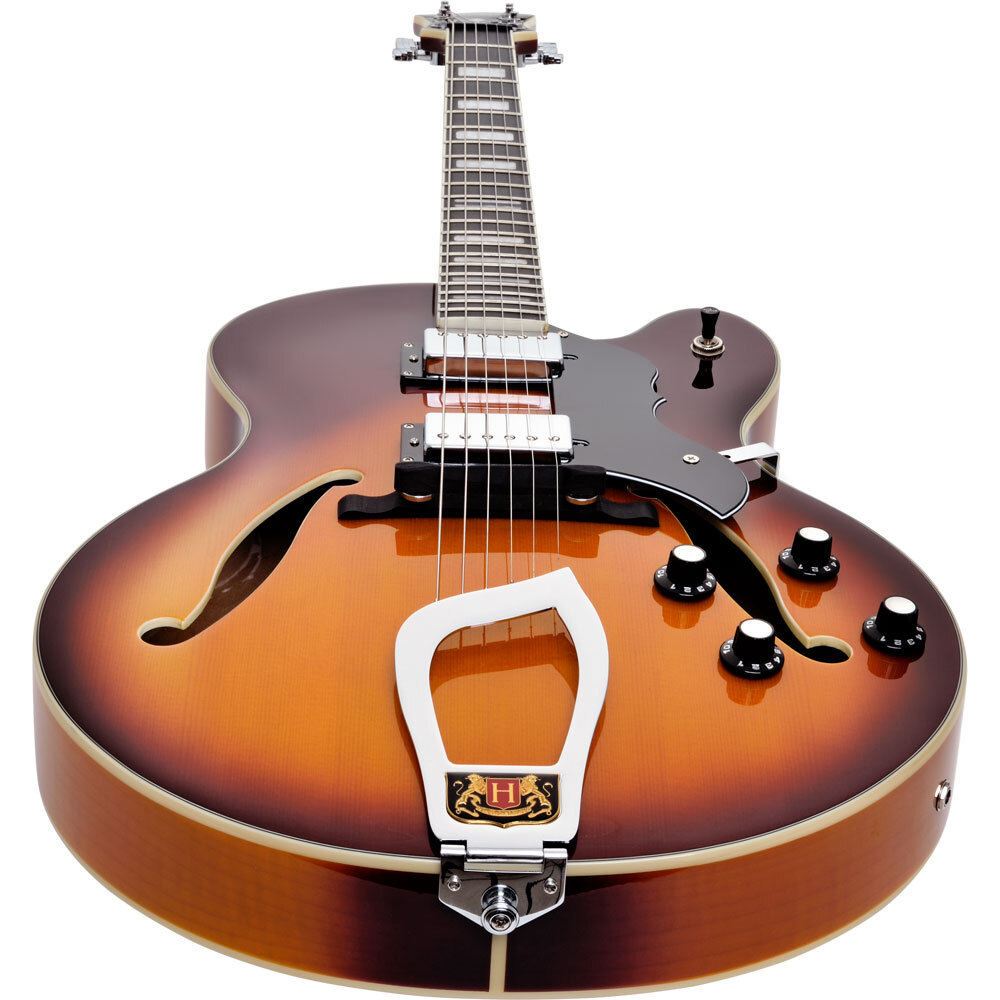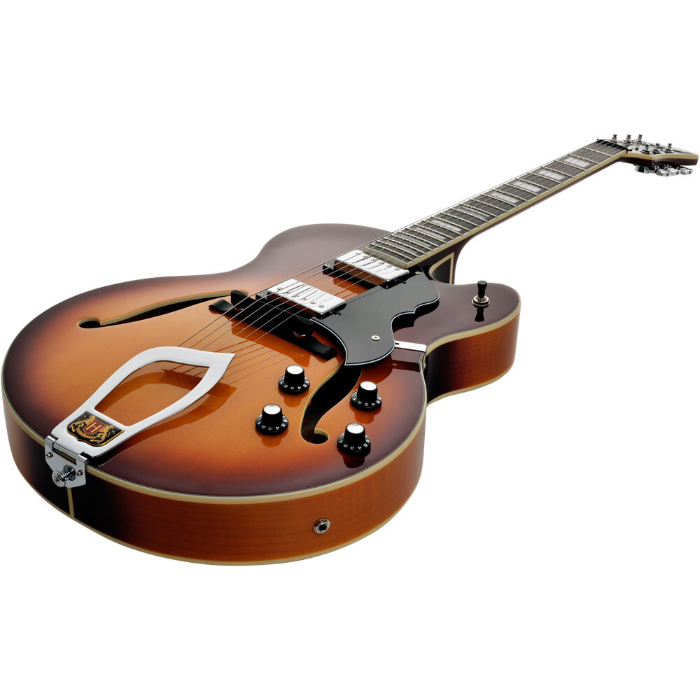 From its hand-carved solid spruce top and neck-body joint at the 16th fret, to its 25-inch (635mm) scale length, Jimmy's masterful touch is woven into the soul Hagstrom's HJ800. Hagstrom's potent Custom 58 Allnico humbucking pickups produce a rich, full-bodied jazz tone with formidable attack. It's up to you to take it on a rock detour into an uncharted sound universe.