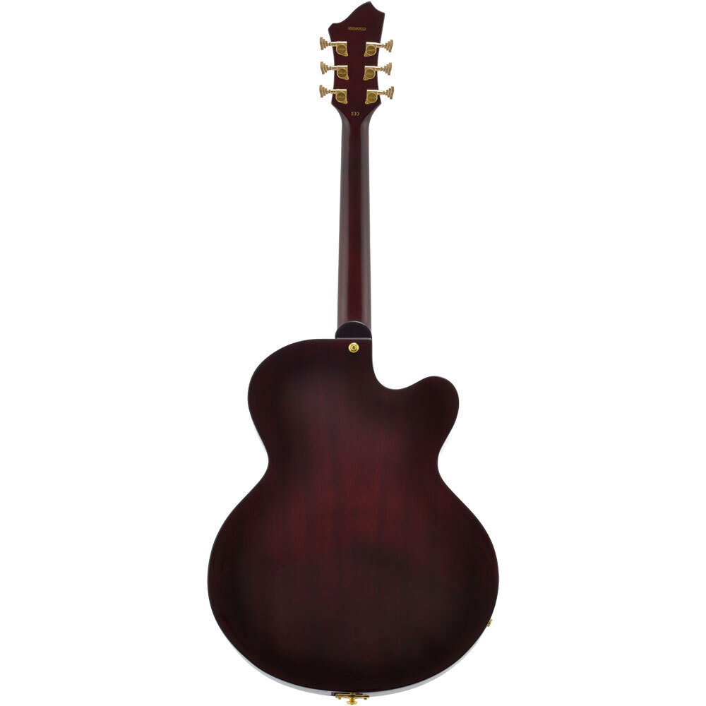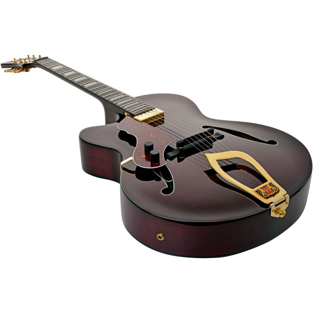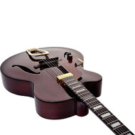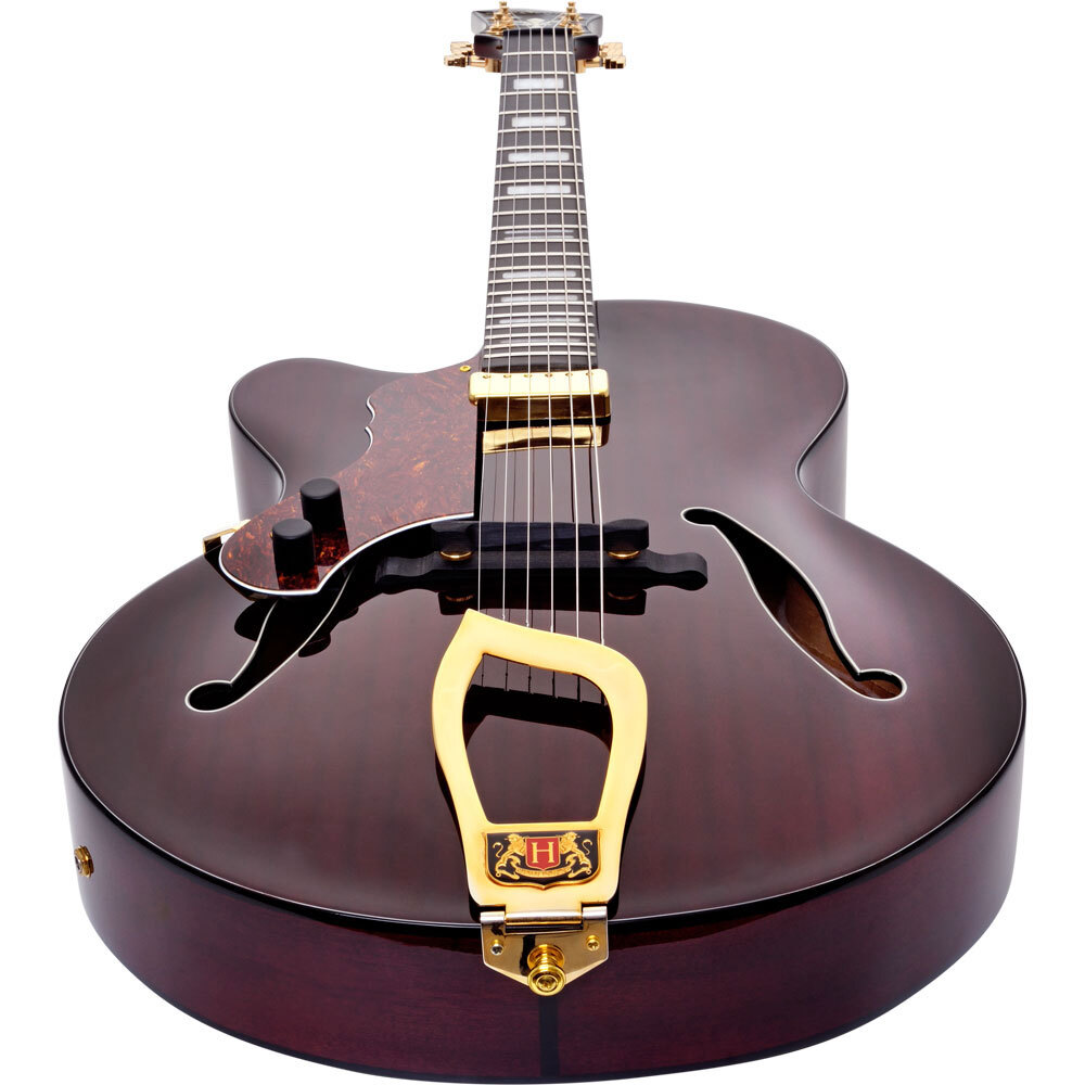 The feel-good warmth of the HL550's mahogany archtop body and set mahogany neck is exquisitely captured by Hagstrom's HF50 floating pickup and shaped by a single volume and tone control. Revered by both professionals and jazz aficionados, the HL550's extended 22-fret playing surface lets you soar even higher with your lead-line ambitions.
