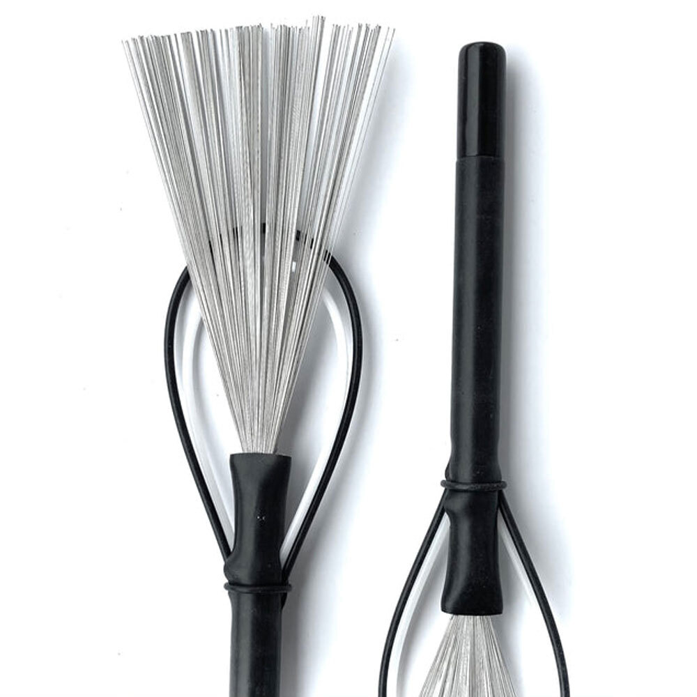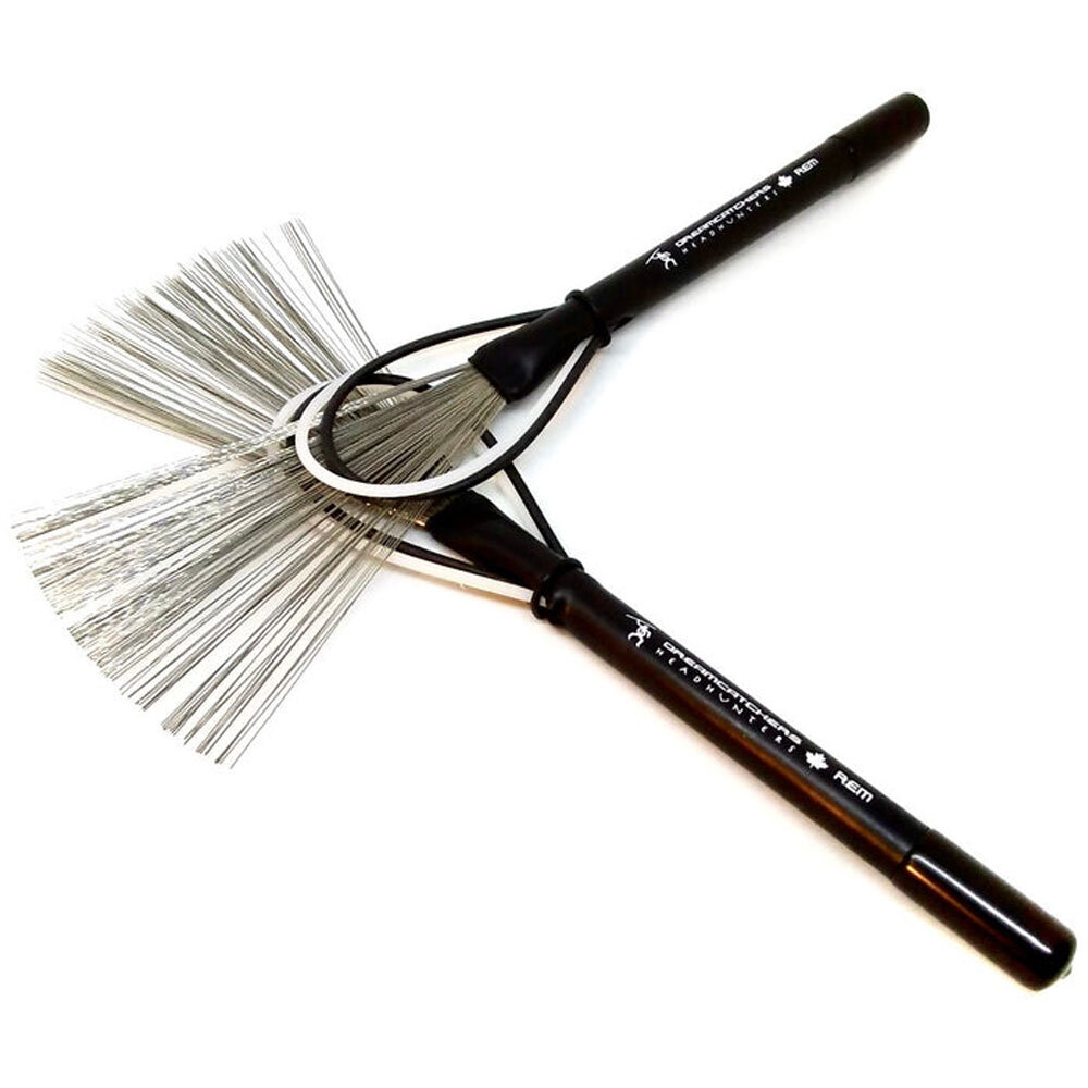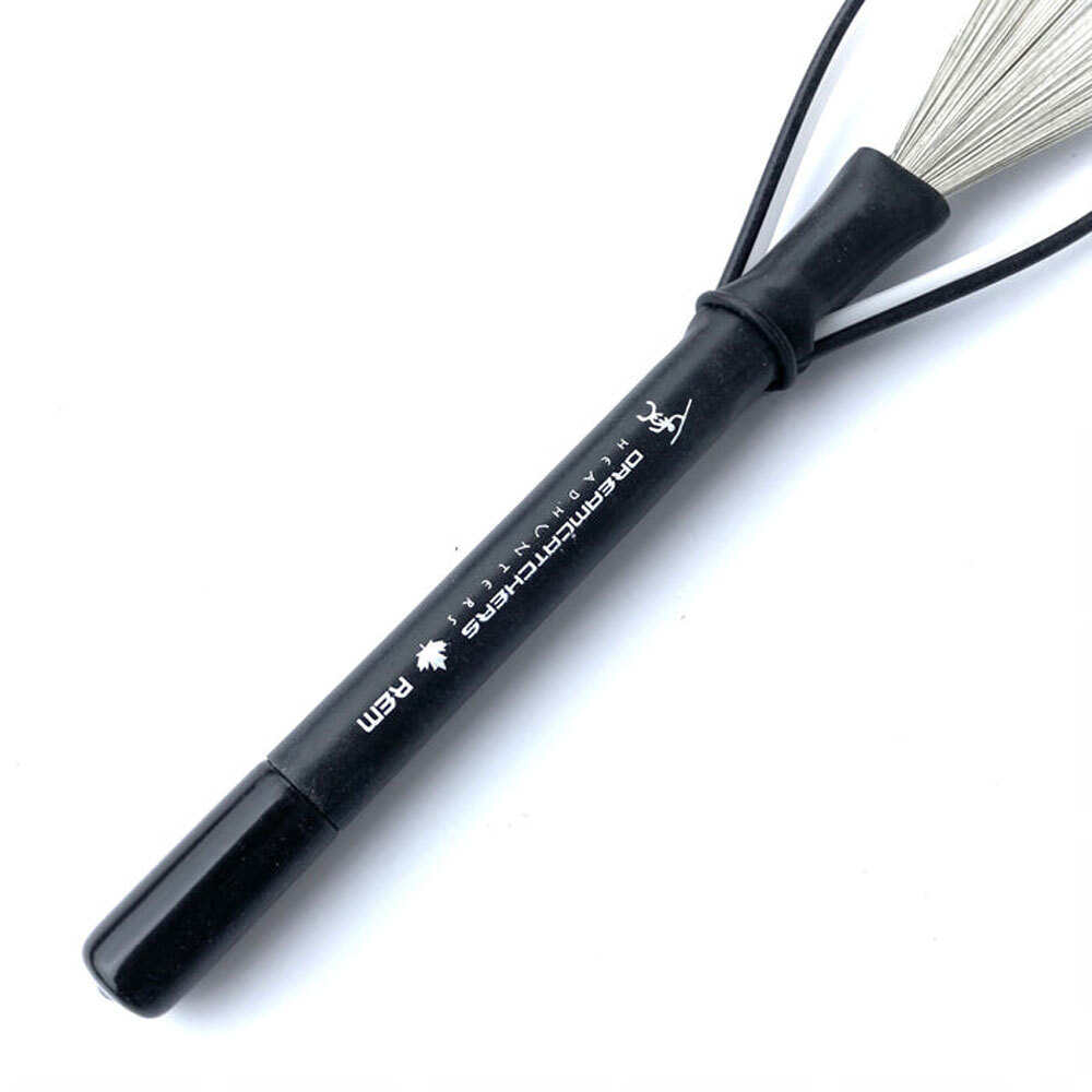Dreamcatchers REM incorporate two adjustable nylon hoops and a traditional non retractable wire brush. The hoops are expandable or can be retracted back to the handle. The hoop can be played upside or downside. The concept is to guarantee a focal point can be achieved with the greatest amount of ease. When playing on the upside a drummer will notice the wires rest against the nylon hoop thereby increasing their ability to rebound at a faster rate. The drummer will also notice the ease with which a simple back beat can be realized when adjusting the 'hoop' to a larger size. REM are back beat enabled and cymbals tone experienced!
