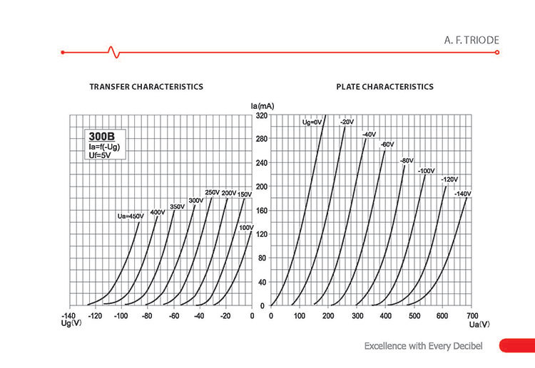 A.F. TRIODE - 300B is a power triode with a directly heated cathode and power of 40 W, mostly for Hi-Fi application. Detailed and clear sound provides real musical reproduction.
