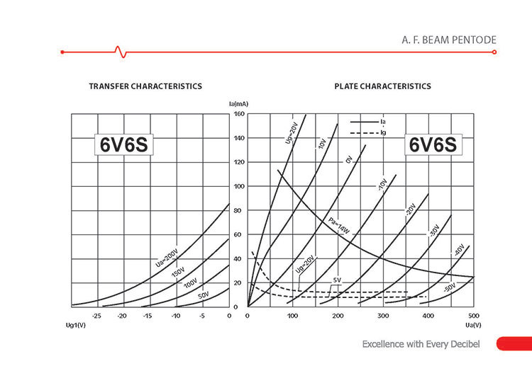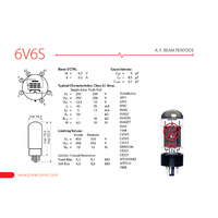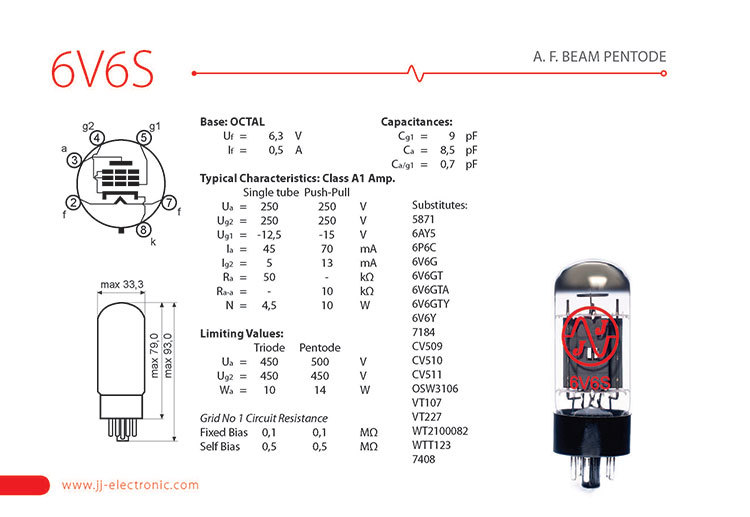 A.F. BEAM PENTODE - 6V6 S is a beam power pentode with octal base and a maximum plate dissipation of 14W. It has fat low end and full mid tones with very good tone separation and a smooth, clean high end. Known to be a very powerful 6V6 due to its robust construction. In general, a very balanced tone. It can be used also in some 6L6 amplifiers.