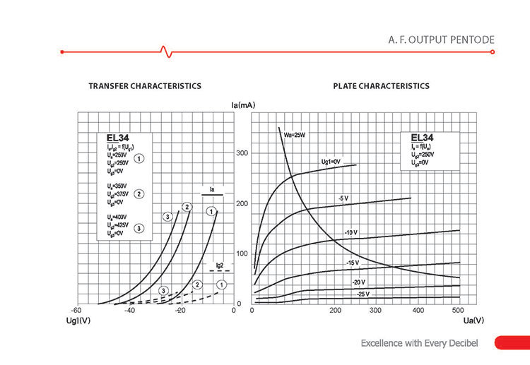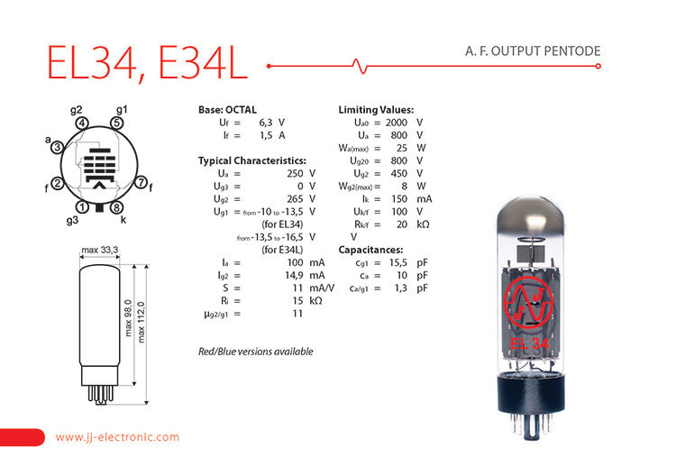 A.F. OUTPUT PENTODE - EL34 is an octal power tube with a maximum plate power of 25W. Very robust and reliable due to its internal construction.