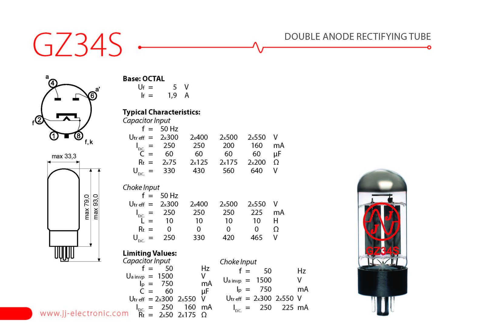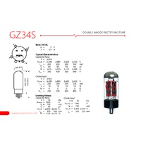 DOUBLE ANODE RECTIFYING TUBE - GZ34S is 5AR4 octal base rectifier diode. It provides strong current output. Suitable for all Hi-Fi and Guitar amplifiers.