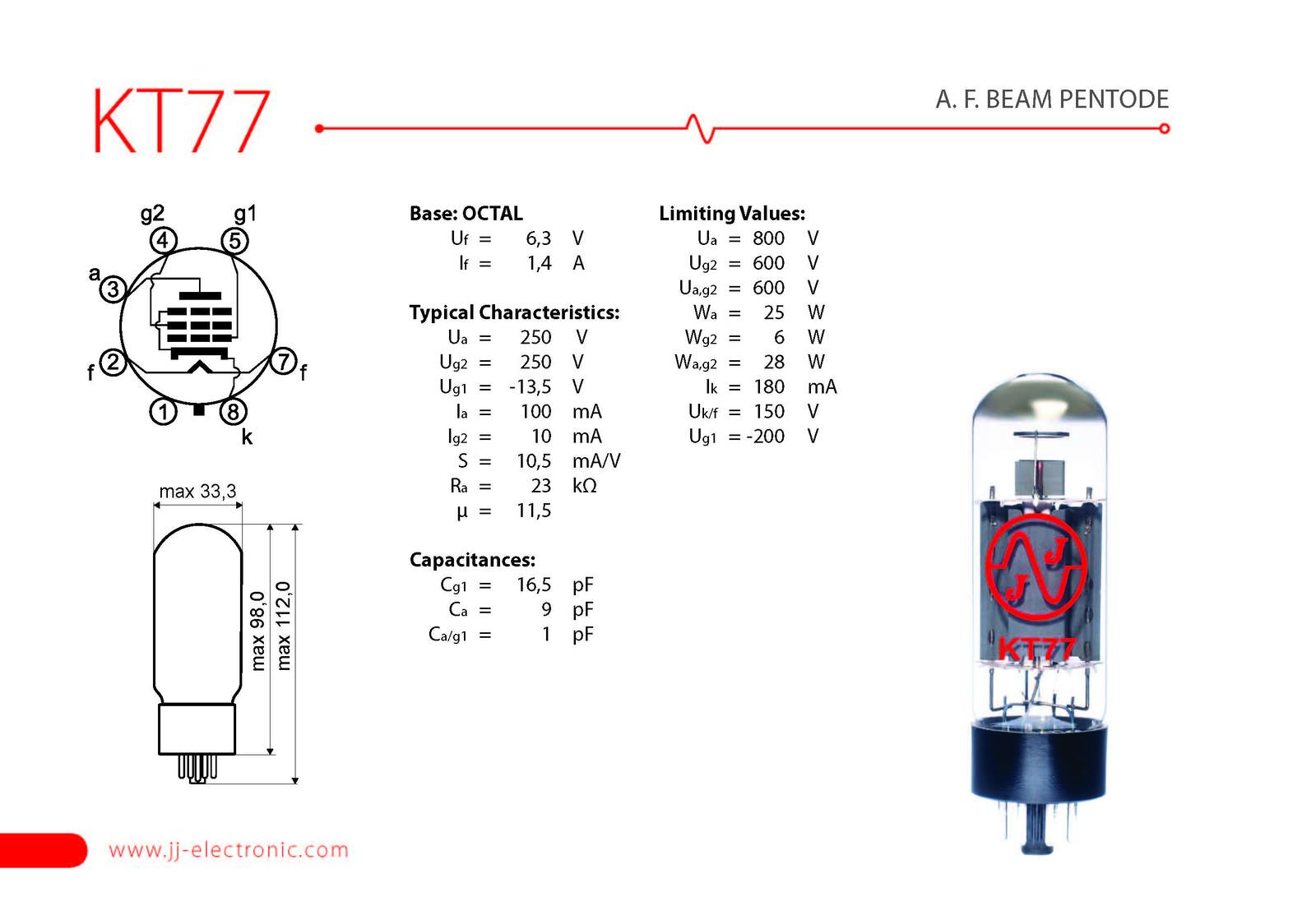 A.F. BEAM PENTODE - KT77 is a beam power pentode with octal base. It can be used in most EL34 amplifiers. It has more power, fatter bass and more headroom than the EL34 and E34L while providing very detailed tones.