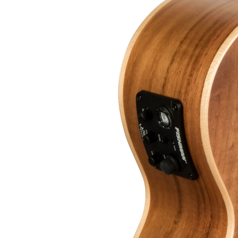 It has a truss rod for easy action adjustments, a wider nut for comfort, select figured woods, open back tuners, wood marquetry, NuBone XB nut and saddle, satin finish, padded gig bag. Acacia resonates with a full richness and has a traditional look. The solid top enhances tone and increases projection. The Fishman pickup with tuner make this an ideal ukulele for stage or recording.