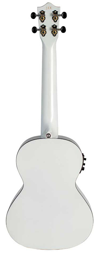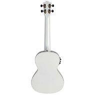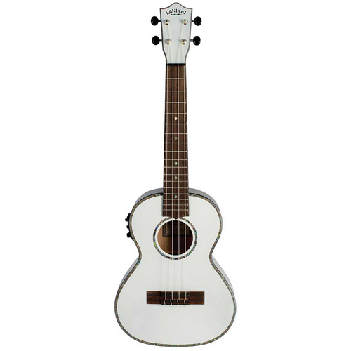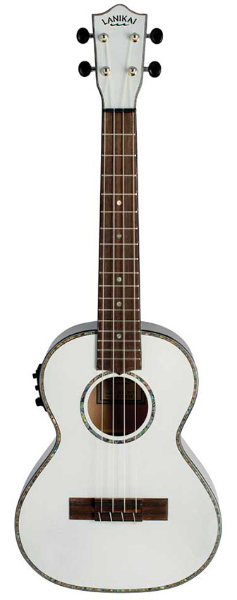 The Lanikai Julia Micheals signature ukulele has a glossy white pearl painted top, back and sides. It is highlighted with black body and fingerboard binding and an abalone rosette and purfling. It is equipped with a wider nut for player comfort, open back tuners with black buttons, NuBone XB black nut and saddle, Fishman Kula preamp and tuner, D'Addario strings and a deluxe 10mm padded gig bag.