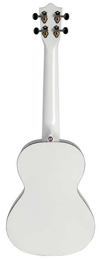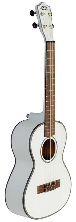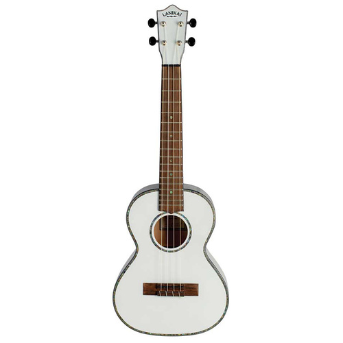 The Lanikai Julia Micheals signature ukulele has a glossy white pearl painted top, back and sides. It is highlighted with black body and fingerboard binding and an abalone rosette and purfling. It is equipped with a wider nut for player comfort, open back tuners with black buttons, NuBone XB black nut and saddle, D'Addario strings and a deluxe 10mm padded gig bag.