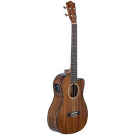 The glossy Lanikai ALL Solid Mahogany cutaway electric baritone ukulele has Grover open back tuners, black ABS body binding with wood purfling, a wide comfortable NuBone XB nut and saddle, D™Addario strings, Fishman Kula preamp and tuner, foam case. Lanikai ALL Solid Mahogany ukuleles resonate with a rich and musical tone.