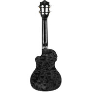 This Lanikai Quilted Maple cutaway electric concert ukulele in trans black provides a wider nut for player comfort, select figured wood, Grover open back tuners on a slotted headstock, multi-ply black ABS body binding, NuBone XB nut and saddle, D'Addario strings, Fishman Kula preamp and tuner, glossy finish and a foam case.